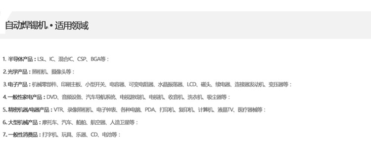 合(he)用(yong)于汽车电子(zi),数(shu)码,电子(zi),电声,LCD,,线路板(ban)等(deng)出产行(xing)业,毗(pi)连(lian)器、R]/收集变ꦏ压器、排线、FPCB拉(la)焊(han)、COF拉(la)焊(han)、电脑主(zhu)板(ban)、CABLE、喇叭和马达等(deng)高品质焊(han)接。